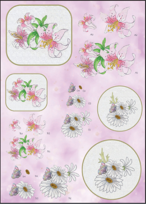 Pack of 10 A4 sheets of Elegant Element flowers, Die Cut and with foiled borders and highlights